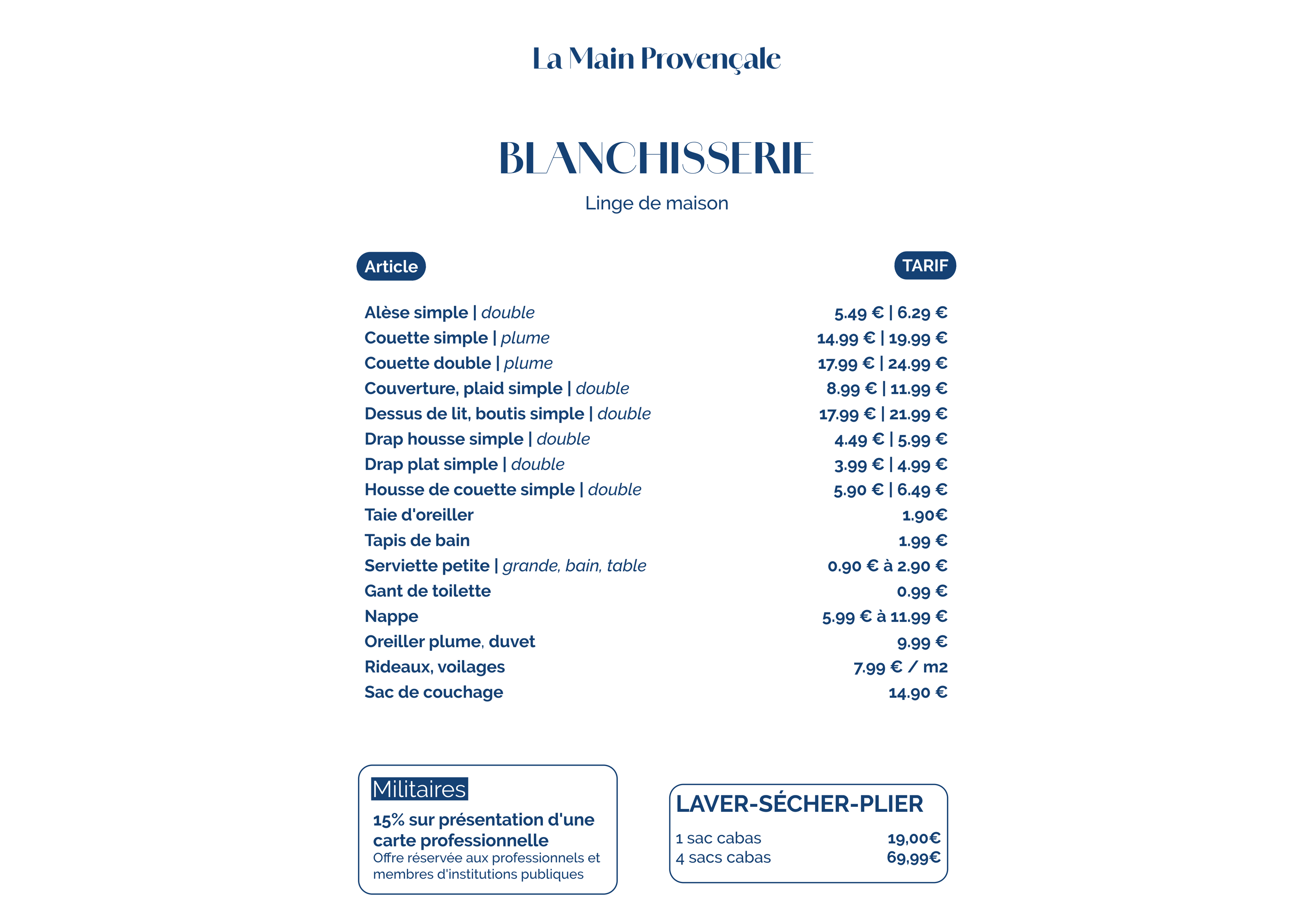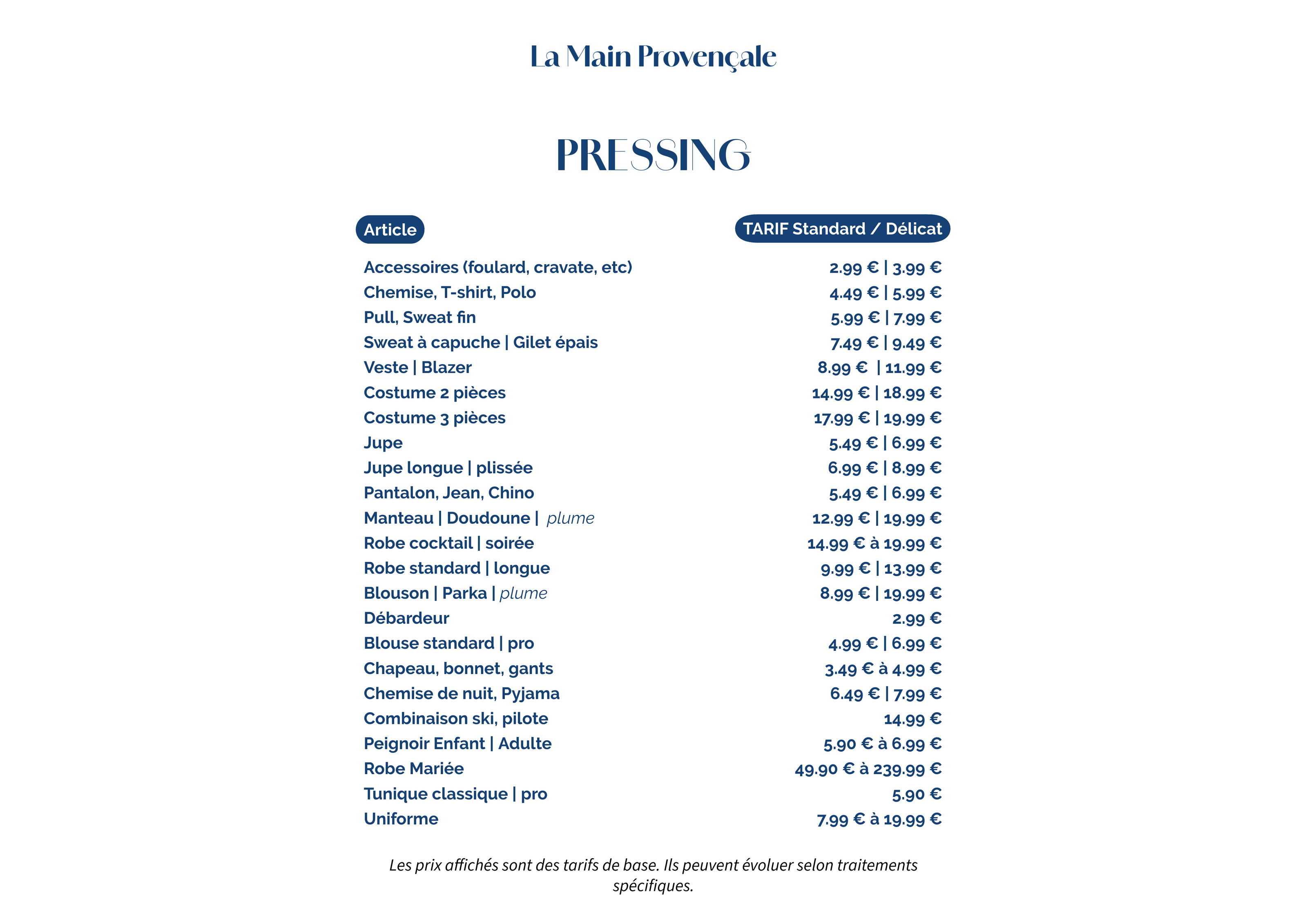 Les tarifs ci-dessous sont publics et destinés aux particuliers souhaitant bénéficier de nos services de pressing ou blanchisserie.